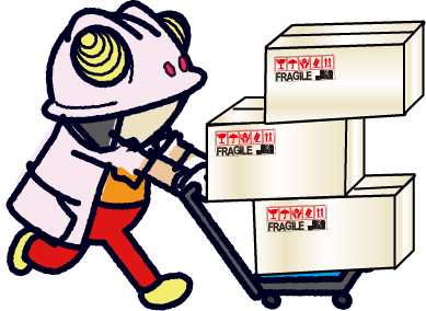 通常のダンボールと、キャスターの付いた強化ダンボール箱(バイウォール)で梱包いたします。