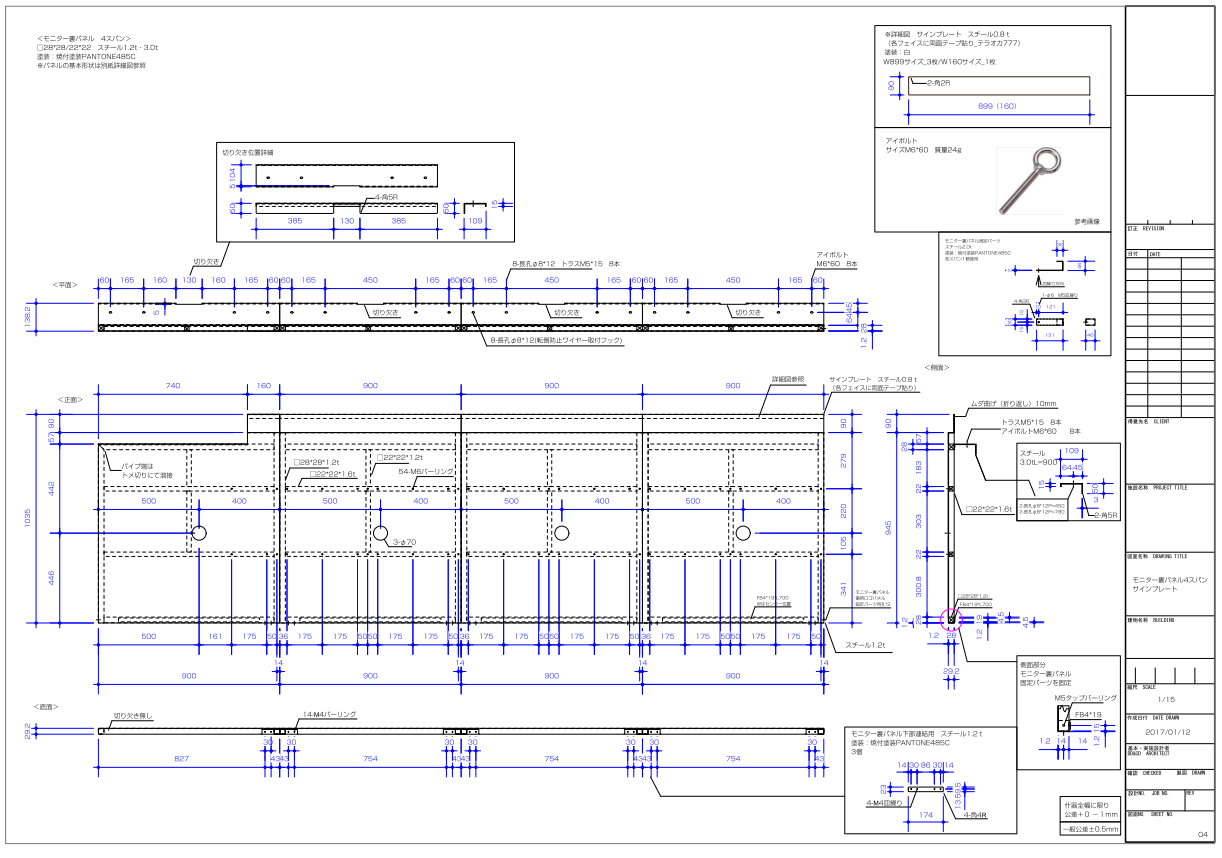 デザイン・設計・図面作成|ゲーム用展示什器 家庭用ゲーム機を展示するための什器の図面。スチールパイプと板金との組み合わせとなります。設置現場に既設什器があり、それを覆い隠す形で設置する仕様となっています。